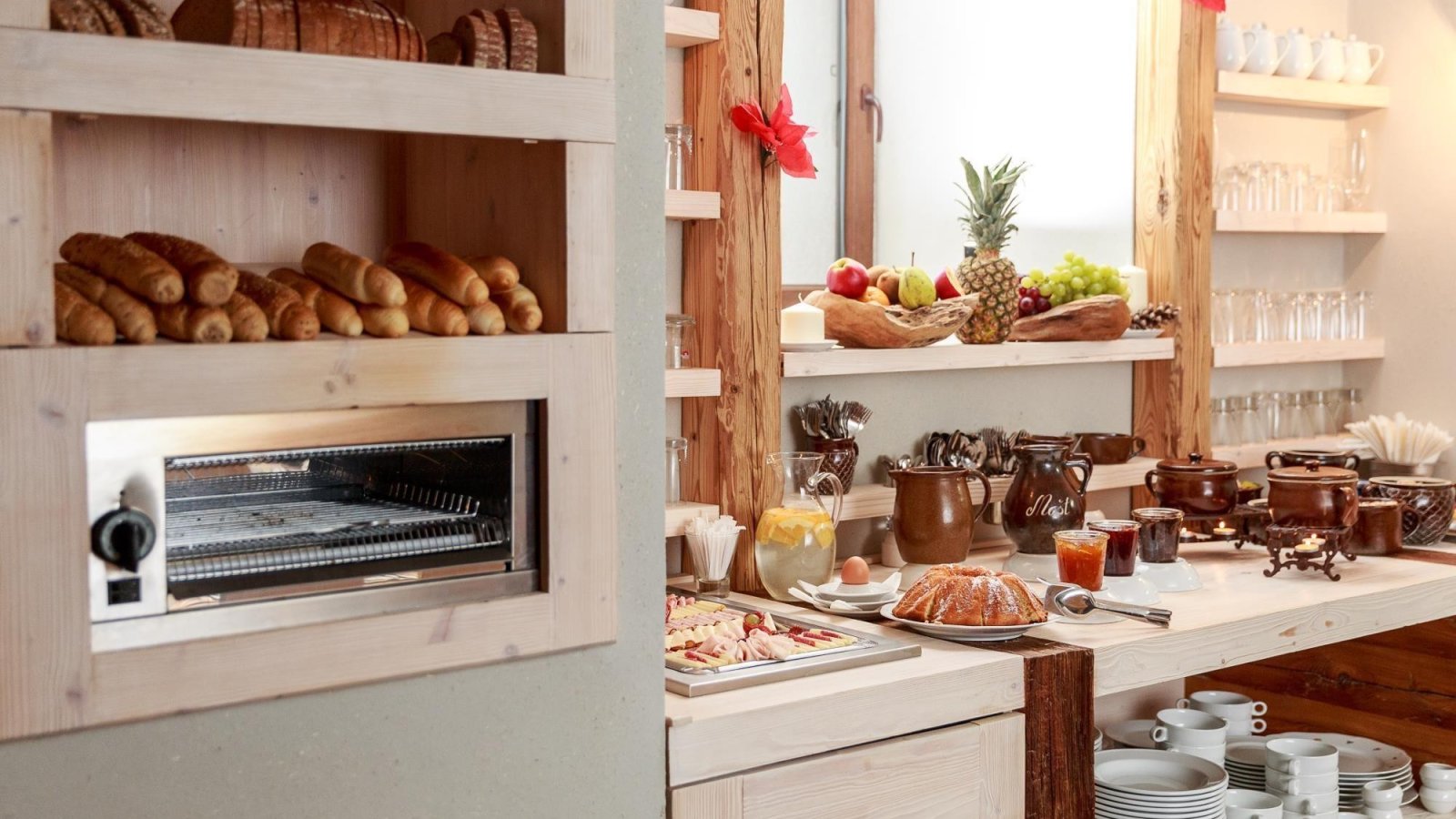 Snídaně se podávají v malovaném sklípku a nabízí Bio mléčné výrobky